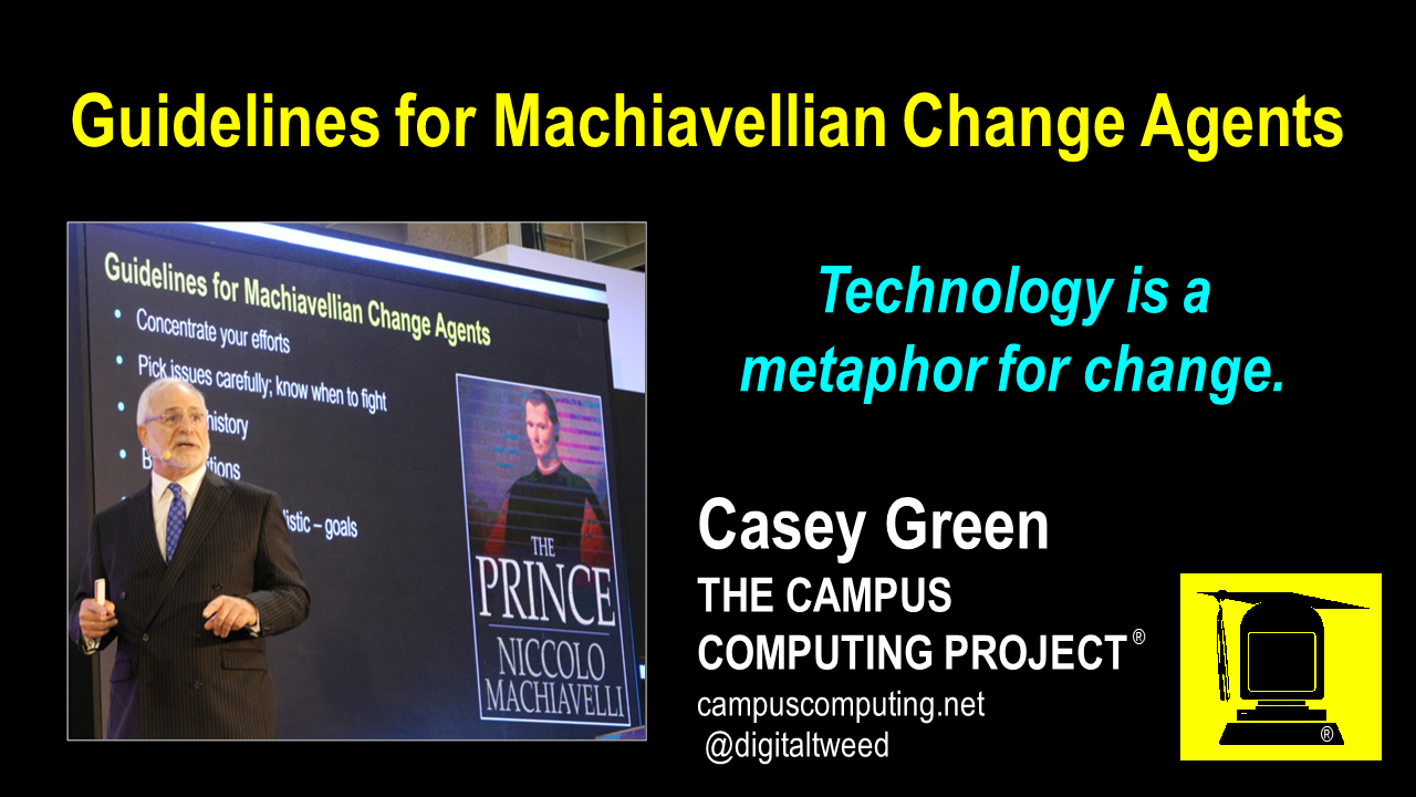 Begun in 1990, The Campus Computing Project® is the largest continuing study of the role of information technology in American higher education. Our projects – the annual Campus Computing Survey of CIOs, national surveys of presidents, provosts, and faculty, and other research activities – draw on qualitative and quantitative data to aid and inform faculty, campus administrators, and others interested in critical IT planning and policy issues that affect American colleges and universities.